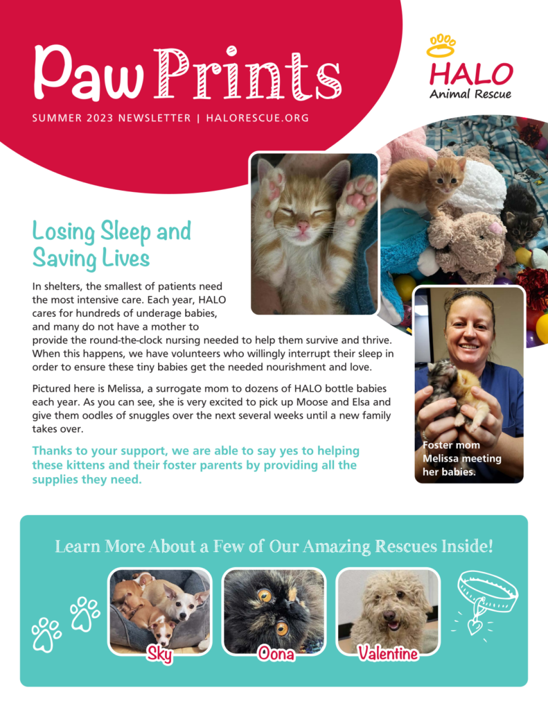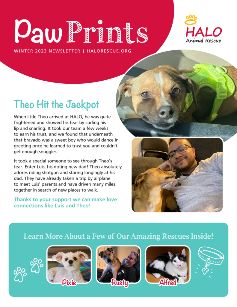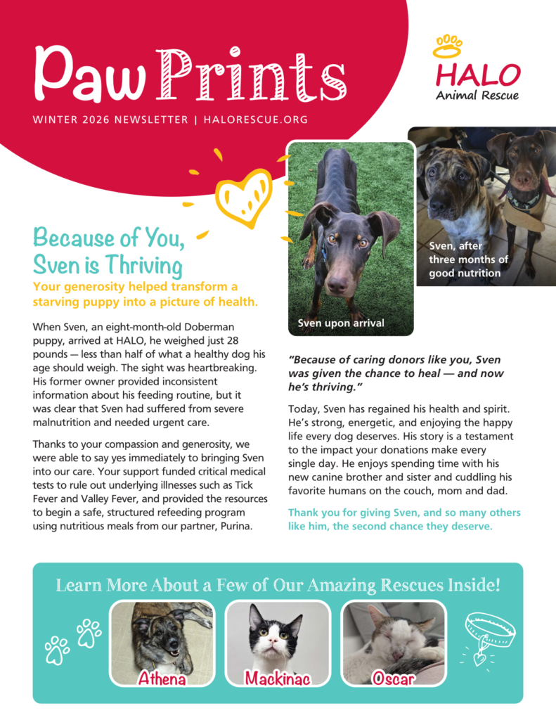 Newsletters Catch up on the latest HALO news and read the inspiring stories of the animals that have been saved! Winter 2026 Newsletter — Click Image ↓ to Read PDF Summer 2025 Newsletter — Click Image ↓ to Read PDF Winter 2025 Newsletter — Click Image ↓ to Read PDF Summer 2024 Newsletter — Click Image ↓ to Read PDF Winter 2024 Newsletter — Click Image ↓ to Read PDF Summer 2023 Newsletter — Click Image ↓ to Read PDF View Archived Newsletters Winter 2023 Newsletter — Click Image ↓ to Read PDF